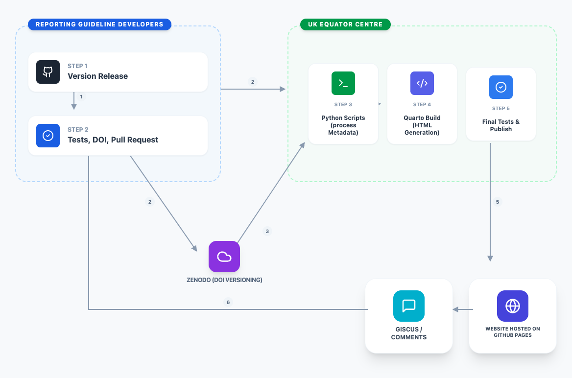 - Once built, the website is served using GitHub Pages. Each reporting guideline item has its own Giscus discussion board, where comments are stored as GitHub Discussions linked to the relevant file stored in the reporting guideline repository.